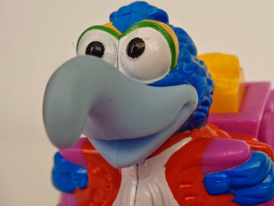 Gonzo spaceship: After Gonzo finally makes contact with his species and escapes in time to greet them he finds himself in a bit of a dilemma, should he go with his new found family or stay with his best friends? The actual spaceship design from the movie hasn't been used here at all instead we get a completely different looking vessel that has a Gonzo head shaped object on the top! This toy is quite simple in its function you simply pull the tiny Gonzo figure who is attached to a string and the spaceship's head rotates while the figure retracts back up it also has a suction cup so you can attach it to a window or another flat surface!